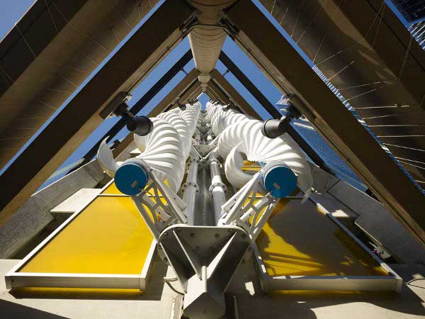 The Greenway Self Park in Chicago works to harness the city’s legendary wind to help power its utilities. Designed by HOK, Greenway Self Park features pairs of corkscrew wind turbines that extend from its base to its roof, collecting wind gusts as they push their way through the streets. If you’ve ever walked around a downtown corner during a Chicago winter, you know just how powerful that force can be. Beyond the turbines, this garage also features natural rainwater collection systems and electric car charging stations for next generation drivers.