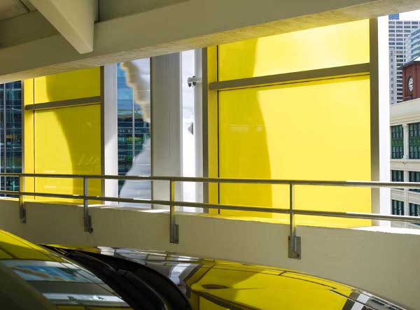 The wild mix of paint colors takes on a functional character based on your position in the Eureka Carpark Melbourne. Designer Axel Peemoeller developed a “way-finding-system” that gives directions to the garage’s visitors as they make their way through its interior. Long lines of color merge to form words as you approach the exit, showing “OUT” in red. “UP” is shown in blue, right as the driver begins to approach a ramp. To make sense of it, check out the gallery below to see what a driver sees as they traverse Eureka Carpark.