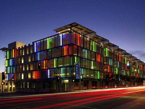 The Santa Monica Civic Center Parking Garage is the world’s first LEED-certified garage, and one of the world’s most visually progressive. Its stunning facade is lit with an offset array of colored light, in blue, green and red. Photovoltaic panels and laminations provide much of the buildings power needs, while natural ventilation takes care of climate control. The materials for this building include many recycled sources and low-impact treatments, constructed with sustainable development practices. Beyond its green heartbeat, the beauty of this garage makes it memorable, one of the highlights of Santa Monica’s architectural identity.